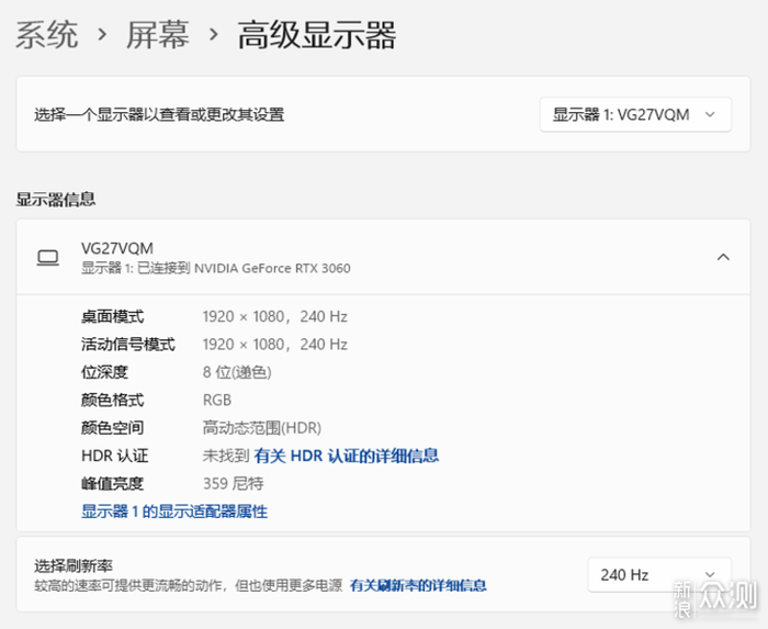 在系统的屏幕信息中可以看到刷新率为240Hz、峰值亮度359nit,8bit色深,支持HDR与屏幕基本配置一致。