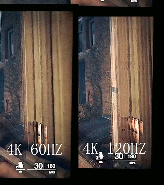 对于实际游戏来说, 同样20X慢速下的60Hz和120Hz 的游戏屏摄画面对比可以看出差别。
