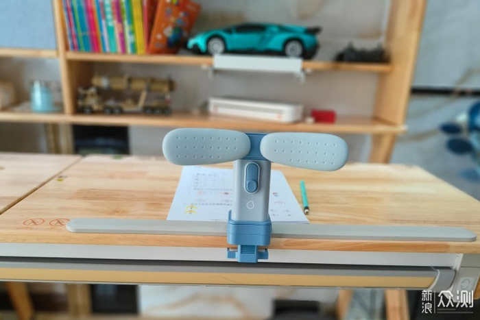 固定在书桌上的样子,大部分桌子都可以固定,只要厚度不超过5厘米,现实中楼主很少见过厚度在5厘米之上的桌子,所以这款小寻坐姿矫正器可以适用于大部分桌子,有着极强的普适性,不用担心桌子厚度不同产品不能使用的问题。固定在课桌上的坐姿矫正器很稳定,使用的时候不用担心晃动等问题。