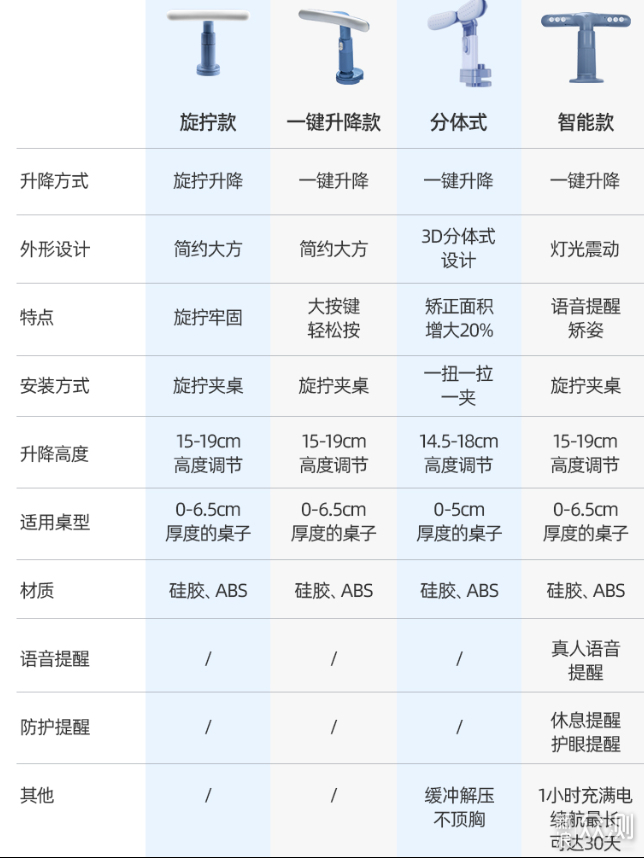 这款坐姿矫正器的升降高度为14.5-18厘米,适合0-5厘米的桌子(当然0厘米的桌子不存在啊,就是很薄的桌子也可以用的意思),材质为硅胶、ABS,相较于智能款,楼主入手的这款分体式坐姿矫正器无法真人语音提醒、休息提醒、护眼提醒等,但是根据介绍说,使用的时候缓冲解压,不顶胸,是否真的有效果,还得孩子上阵,亲自体验一番才能下结论。