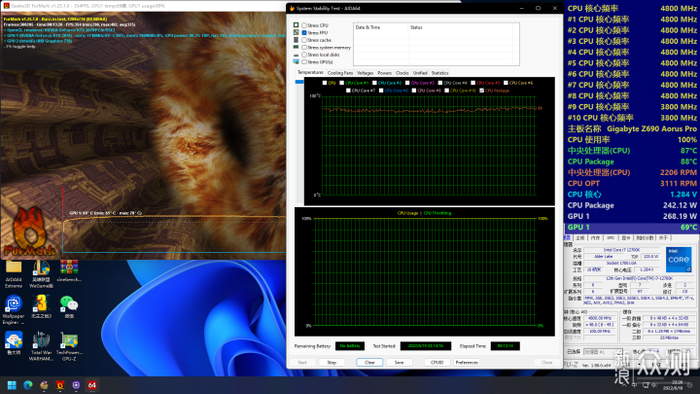 CPU Package 温度在87-88度,显卡温度维持在69-70度,对比单烤只高了一度,说明九州风神CK500机箱非常适合安装前置360冷排。