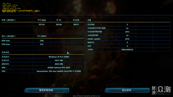 平均357.44FPS,CPU Time 3.91毫秒,GPU Time 2.8毫秒。