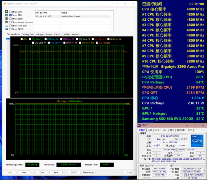 电压1.284V,功耗235W,CPUPackage 温度在86-87度反复横跳。