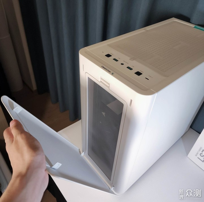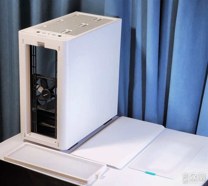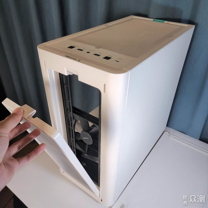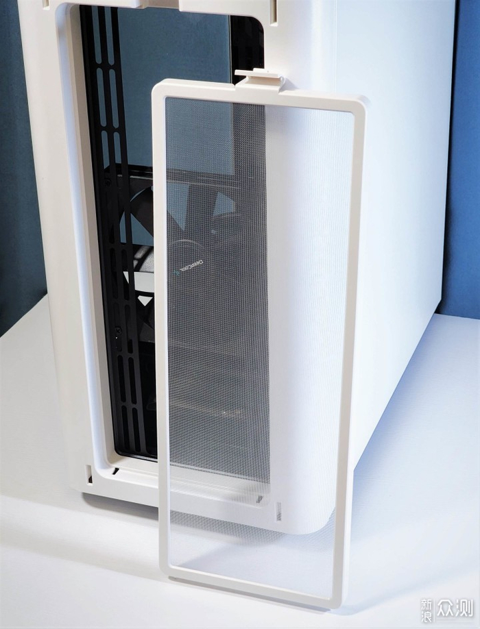 前面板磁吸式快拆设计,拆下后内有白色防尘网,同样可以拆卸,机箱上部同样为磁吸式防尘网,配有绿色提手方便拆卸,整体设计非常有特色。
