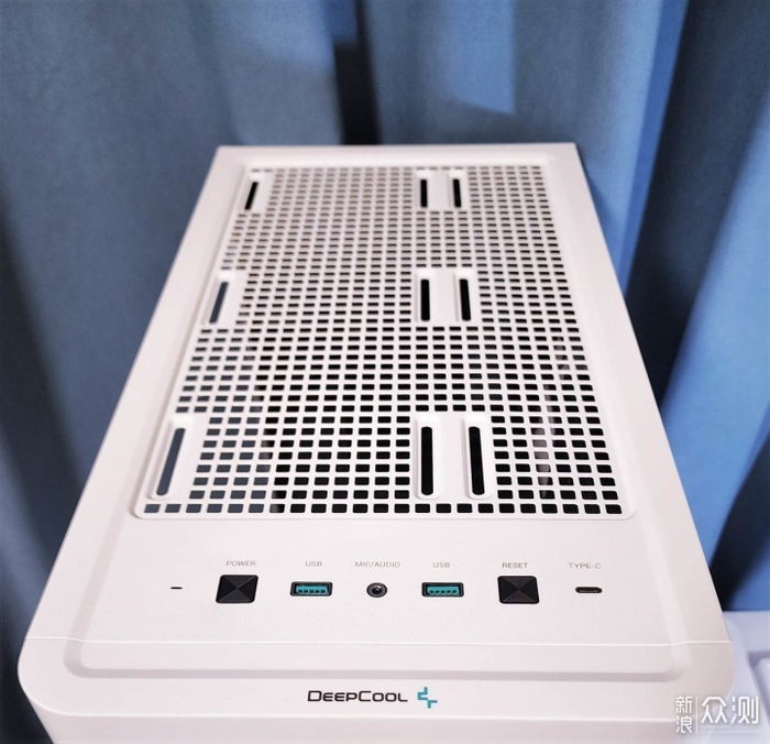 配有两个USB3.0接口,一个USB3.2协议的Type-C接口,一个耳机麦克风2合1接口,硬盘指示灯,开机、复位按钮,非常齐全。