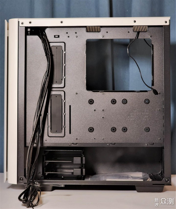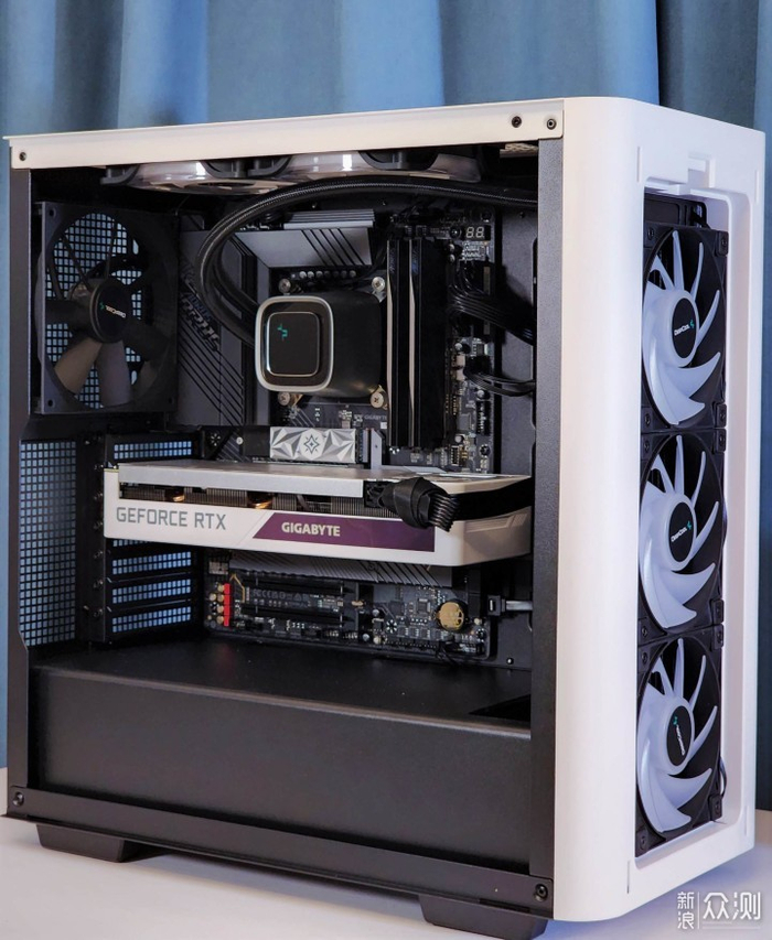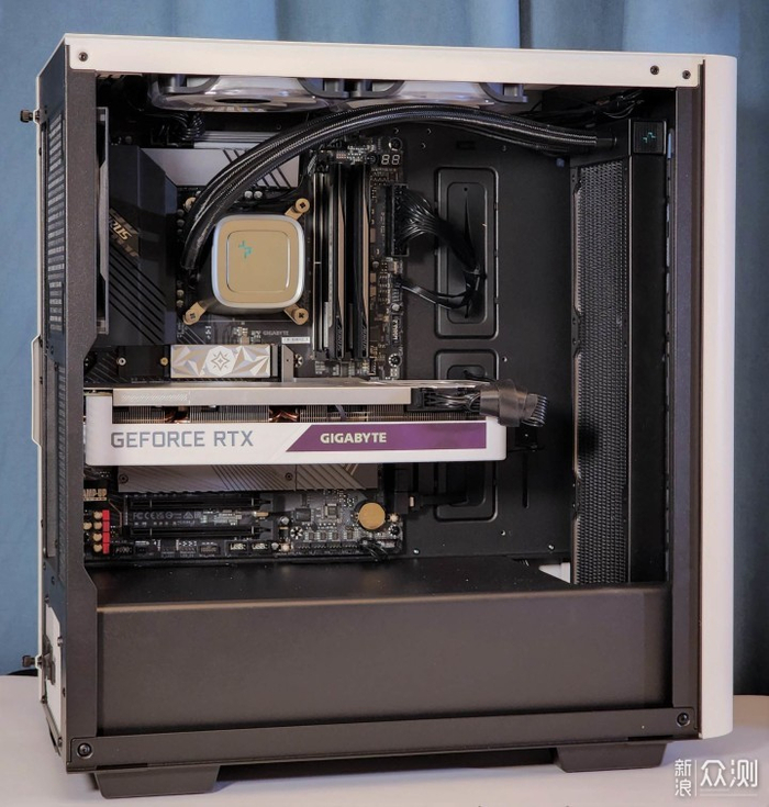 机箱支持前置360水冷安装,上置280/240水冷安装,此次装机为前面板进风直吹冷排,机箱后置风扇与上置两个风扇作为排风扇排出CPU水冷冷排、显卡带来的热气。