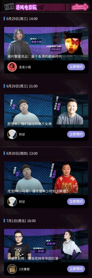 6月29日围绕香港电影话题有两场直播:当天下午14点,由电影策划、编剧、影评人“走走小姐”和《巴塞电影》主编、电影博主“Mr.WG”带来主题为《港片警匪风云:属于香港的巅峰时代》的直播,一起回顾港片如何辉煌,又如何衰败。晚上21点,喜马拉雅影视频道头部播客阿甘将对谈专栏作家、影评人韩松落,主题为《那些年,我们追过的港片女神》,聊聊为什么在那个年代会出现那么多令人印象深刻的女港星?