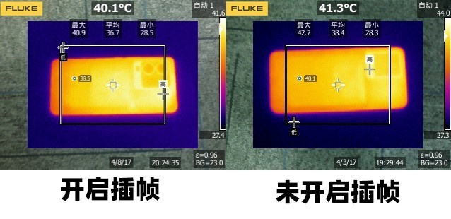 用上独显芯片后,性能狗监测到核心的运行帧率为44.7帧,卡顿次数更少。同时,芯片负载降低后能耗更低,发热也更小,这一点从开启插帧和未开启插帧的游戏机身温度就可以看出来。