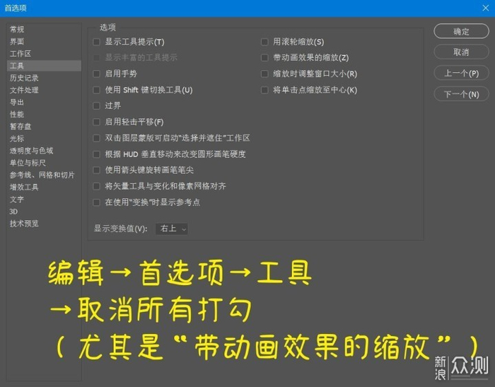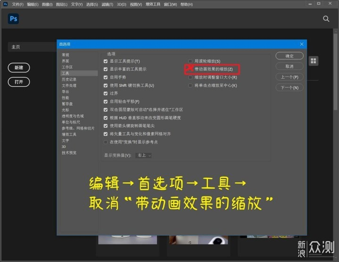 打开Photoshop,在菜单栏里选择“编辑”,再选择“首选项”,如下图所示,点击左侧“工具”,在右侧这一栏里,有许多选项,我们分两次尝试,第一次其他选项不动,把“带动画效果的缩放”前面的勾选取消了,点击“确定”,然后关闭首选项这个页面,再测试新建一个画布,缩放是否顺畅。