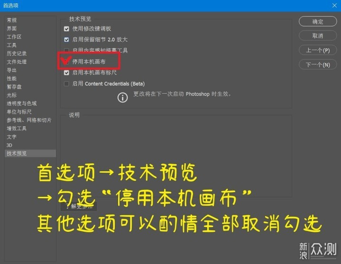 很关键的一项,许多网友做完前两步后,缩放卡顿依然没有消失或改善,那么这一步是必须的。还是“首选项”,选择“技术预览”,把倒数第三项“停用本机画布”前的对号挑上,点“确认”再测试一下是否解决。个人建议配置一般的,可以把“技术预览”除了刚才哪一项,其余的勾选全部取消。