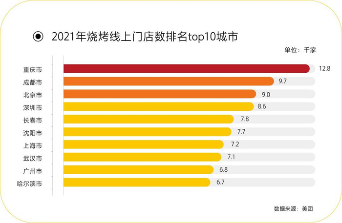 烧烤门店的地域分布正在从南北不均转变为并驱发展。在2021年烧烤线上门店数排名top10城市中,深圳、广州分别居排名的第四位、第九位。而在订单量增速排名中,前十名中有9座是南方城市,其中芜湖市以90.3%的增速占据第一名。