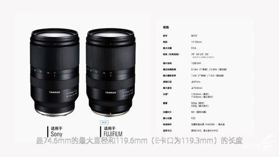 光学结构和此前腾龙E卡口的腾龙17-70mm F/2.8完全一致,仍然是12组16片的光学结构,同样也是9片的光圈叶片,X卡口腾龙17-70mm F/2.8的体积为74.6mm×119.6mm,整体的重量为530g。