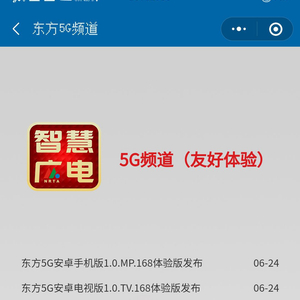 中国广电近期发布了全新智慧广电 5g 频道(友好体验),来自于中国广电营业厅微信小程序广告栏,显示 6 月 24 日发布“东方 5G 安卓手机版”(暂无苹果手机版)“东方 5G 安卓电视版”两个体验版 App,此前并未对外开放下载。