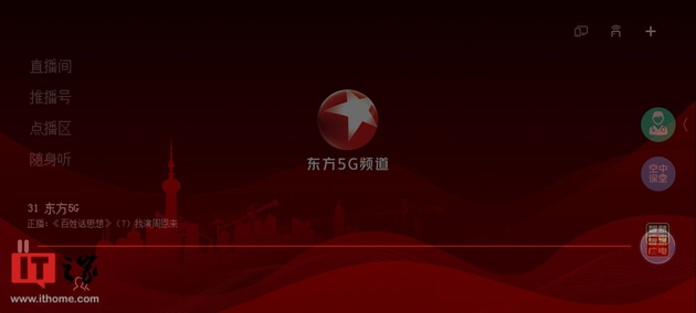 应用打开后,主界面先进入到上海台的“东方 5G 频道”卫视直播频道,其还包含了“推播号”、“点播区”、“随身听”三个视听专区。