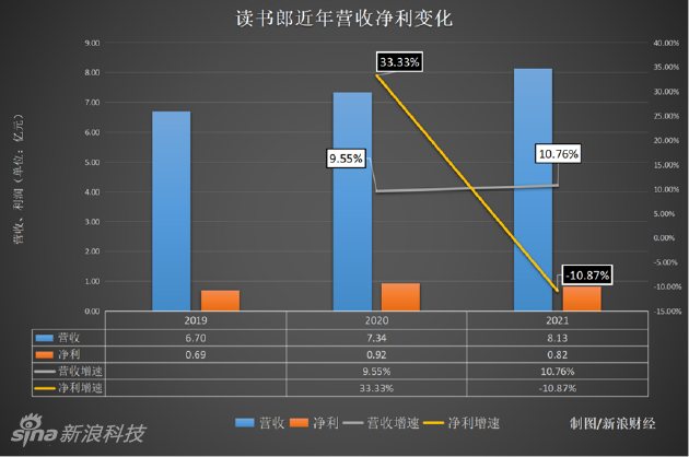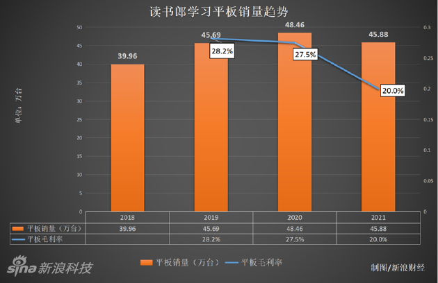 2021年,读书郎的整体毛利率从2020年的27.5%下降至20.8%;净利润也从2020年的0.92亿元下降至0.82亿元,同比下滑超10%。