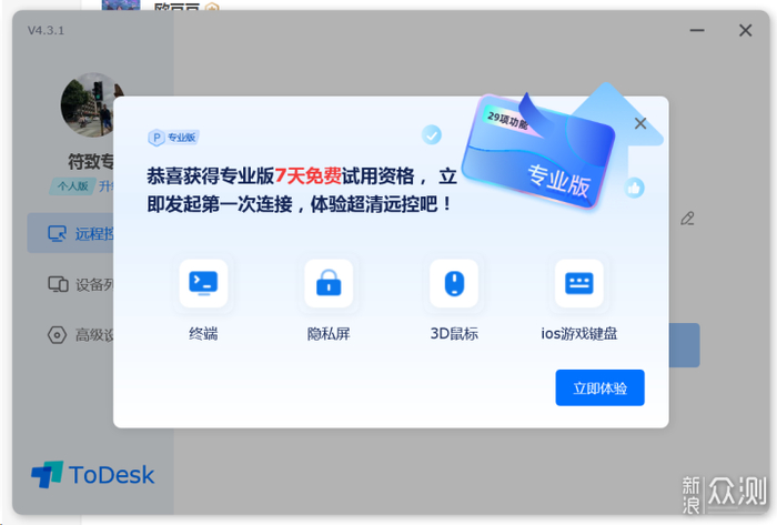 这次根据ToDesk官方公号通知,更新到4.3.1版本后,参加了专业版的试用体验。不得不说,花钱的跟免费的体验也太不一样了。