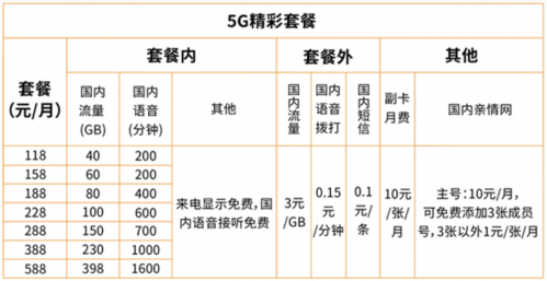 中国广电5G官网显示,广电推出了两种通信服务套餐,分别为5G精彩套餐和精彩套餐,其中,5G套餐业务共分为7档,月费从118元至588元不等。中国广电对5G精彩套餐的宣传语为简约、优质、超大容量,总结了三大卖点:黄金频段、优质套餐、精彩靓号。