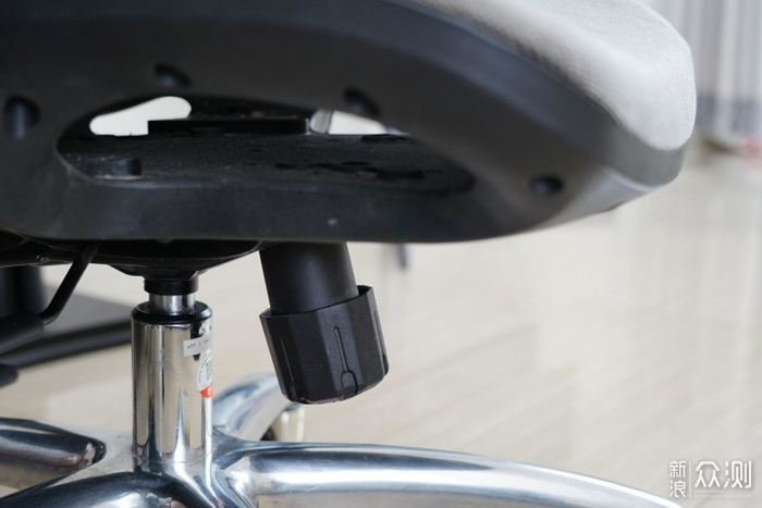 另外从回弹力调节来看,旧款大多数会在坐垫底部看到一个下图这种大旋钮,这种是略显过时的普通机械底盘,通过顺逆时针调节背靠回弹力,但这种结构实际上一点都不好用,坐姿深浅改变就会感觉背靠过硬或者过软。