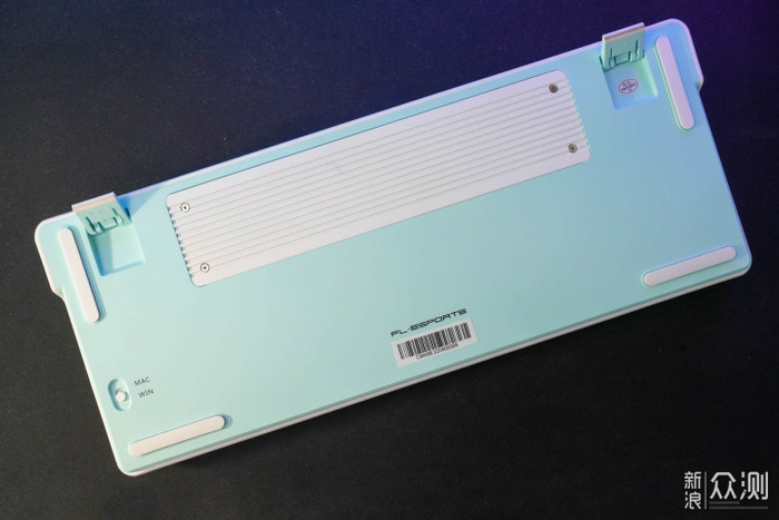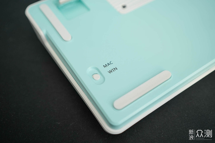四根长条橡胶脚垫,放在桌面非常稳,几乎感觉不到键盘有晃动,这也是保持手感的重要因素,另外这款键盘还支持MAC/WIN系统切换,开关也在底下。