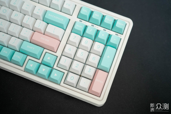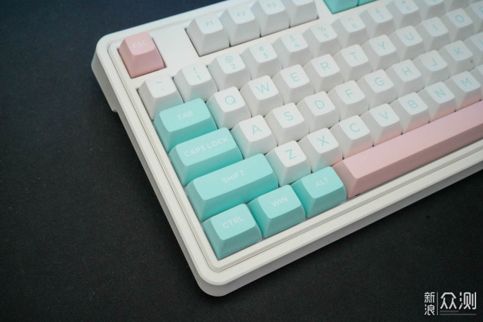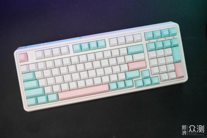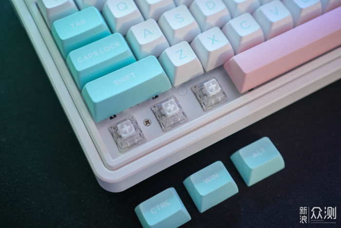 这款棉花糖配色,白蓝粉键帽看起来特别清爽,实物颜色挺鲜艳,男生女生都能驾驭,看起来仙仙的。