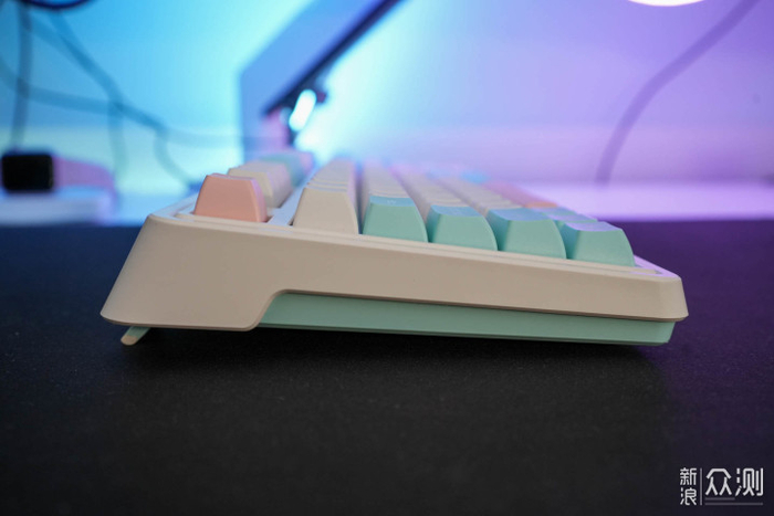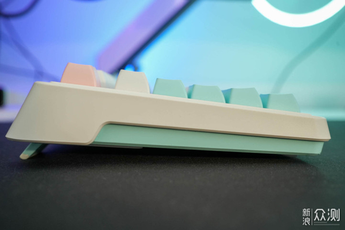 键盘白色上盖与蓝色下盖在侧面不是对齐的,这样的设计不光看起来有特点,抬起键盘也有地方抓,毕竟是一公斤多的键盘,相信我拿起来比看着要重不少。