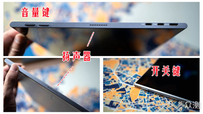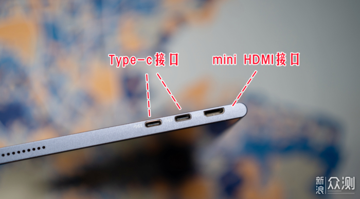 右侧靠下的位置是接口,分别是2个全功能Type-c接口和1个mini HDMI接口,2个Type-c接口支持盲插,既可以作为电源接口,也可以作为视频输入接口。