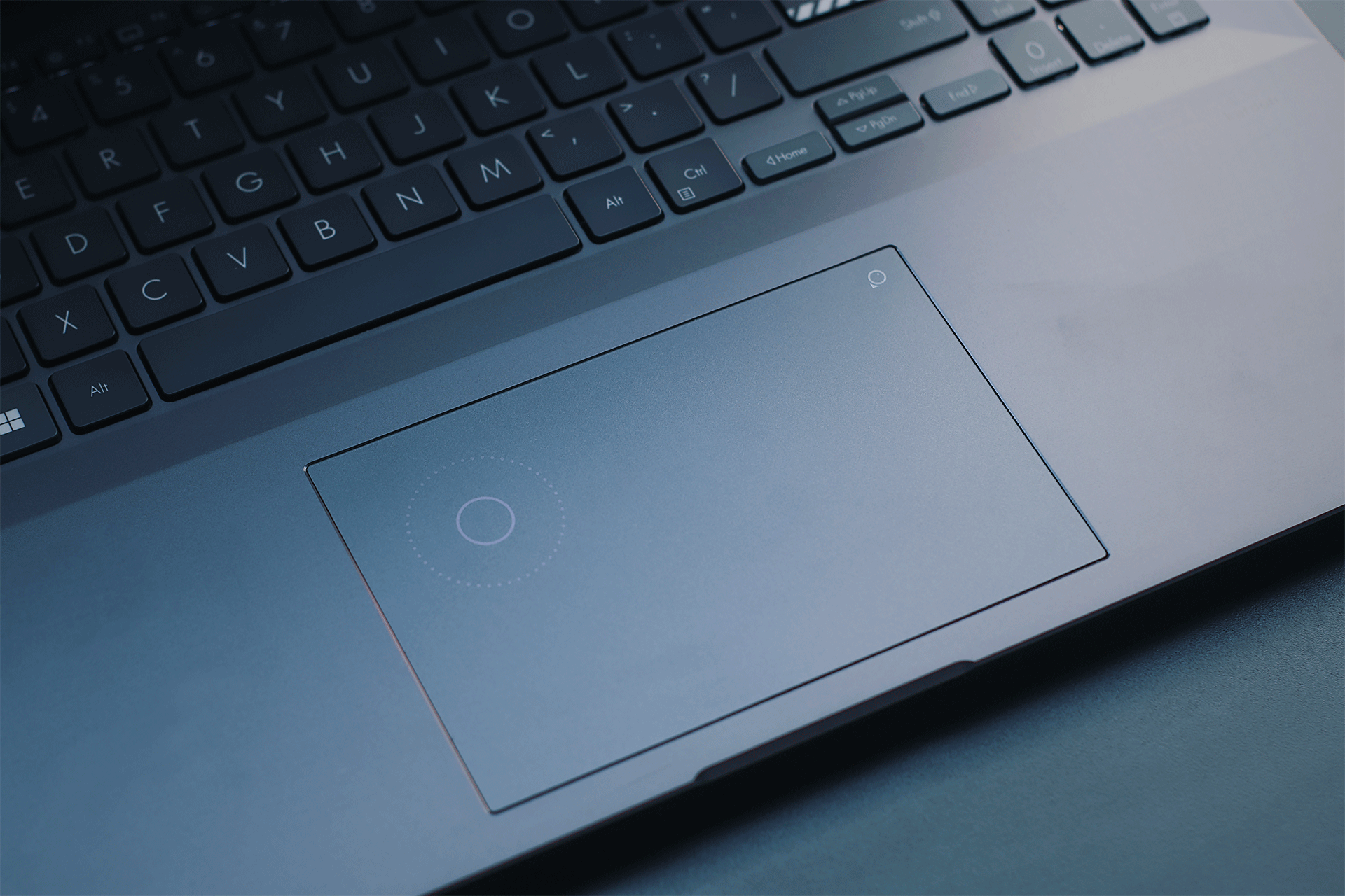 也得益于其16英寸大屏优势,在C面的触控板达到了6.1英寸。采用磨砂玻璃表面,结合它上面的疏水涂层,手感是真的顺滑细腻。这些都还在预期内,最让我惊喜的还是它还在触控板上设计了一枚华硕DialPad虚拟旋钮,通过点击右上角的小图标并向内滑动即可触发点亮。