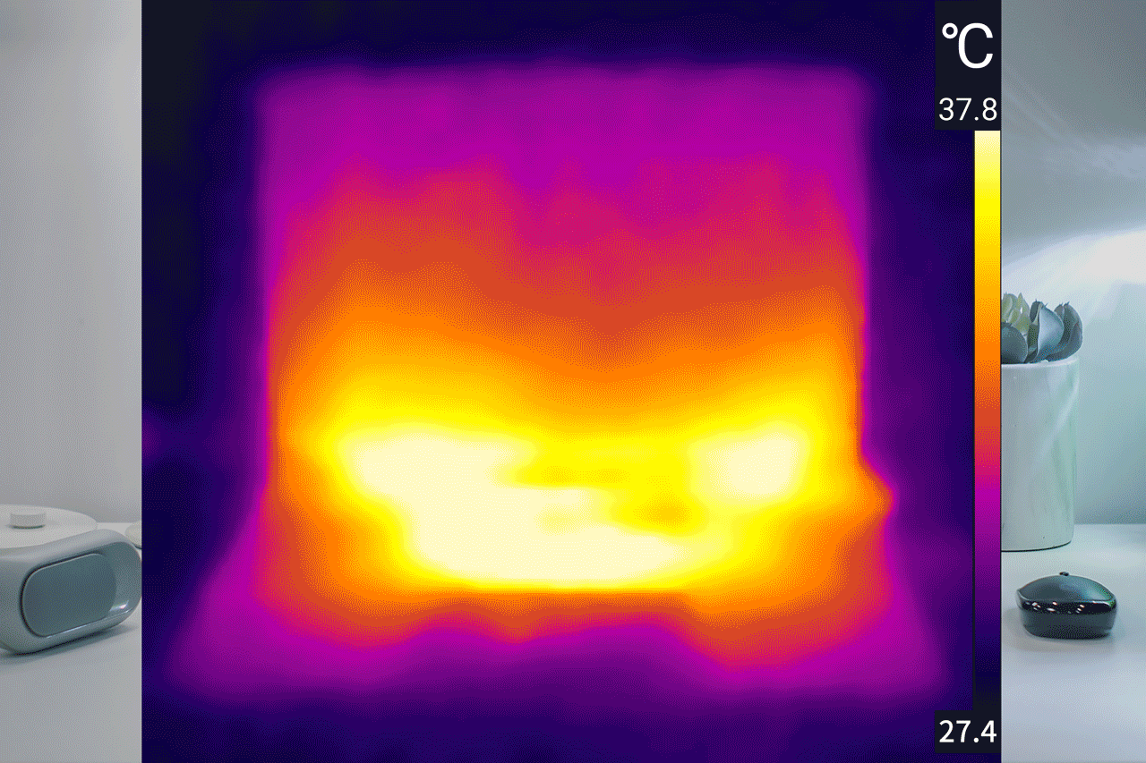 在经过前面几轮跑分后,使用红外热传感工具看了下热量分布,室温27度,最高温度分布在键盘中间区域和屏幕下方的两侧,仅有37.8度,完全不烫。在这个天气渐热的时期,表现可以说超出我的预期。另外,那屏幕下方两侧的发热区域其实并不是屏幕里面的发热,而是转轴的散热出风,从屏幕前方空隙发散。