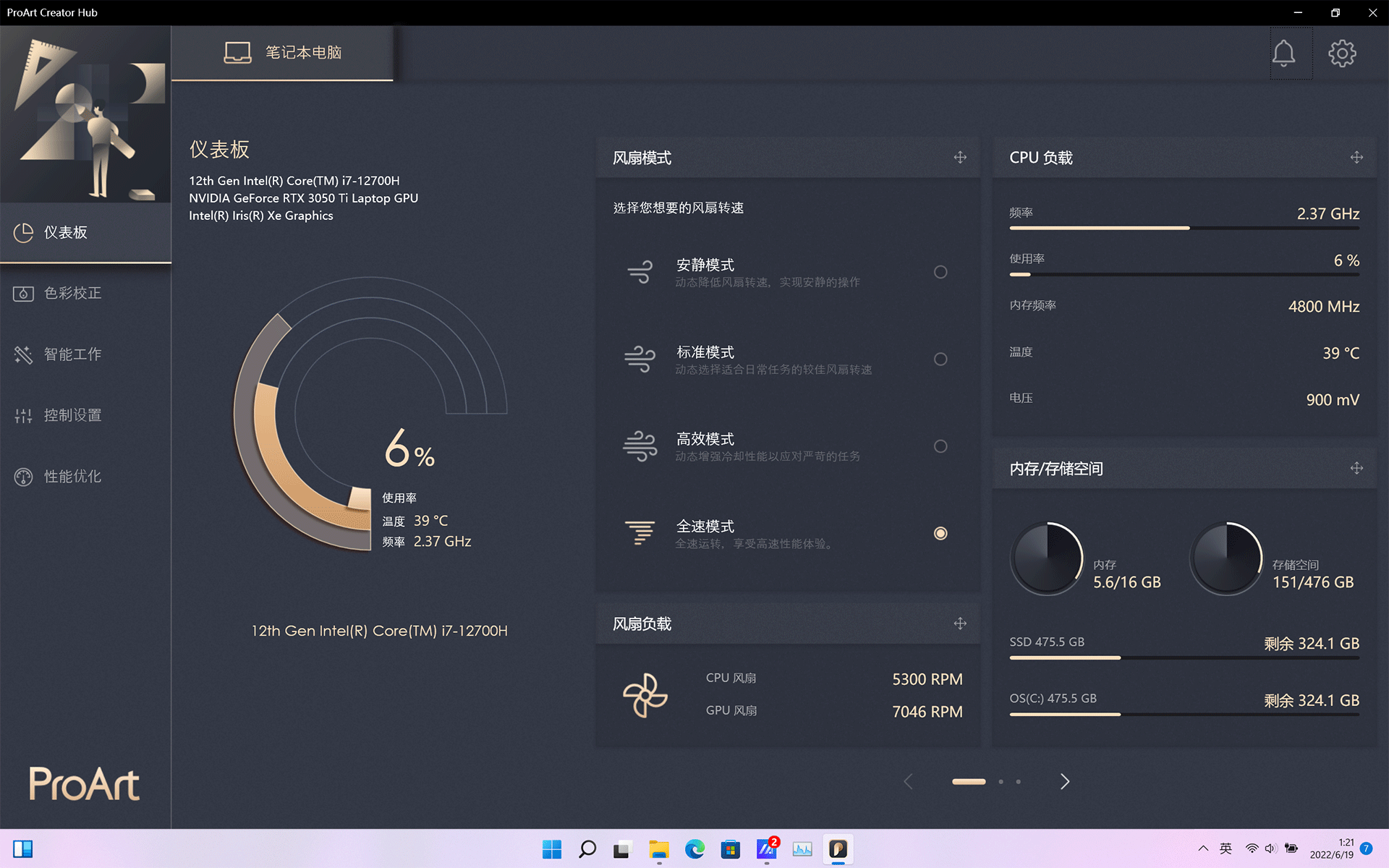 如果你仅仅做硬件层面的堆砌组装,在如今的行业里是很难走远的,作为老牌PC厂家,华硕也更明白这点。为了更好的使用体验,灵耀Pro16 2022在软件层面也下了很多功夫。通过它预装的创作者中心(ProArt Creator Hub),你不仅可以自定义调整华硕DialPad虚拟旋钮上超过70个功能,还能通过它里面的仪表板界面实时监控和优化系统性能。色彩校正页面直接内置了屏幕校色工具,可以搭配硬件校色器,进一步调整屏幕各项参数。目前我使用频率最高的功能应该是里面的智能工作标签,我会把图形图像处理相关的软件分配到一个任务组,能独立发送到桌面,这样点开桌面单独任务组快捷图标,就能同时启动指定的几个应用,提升我的后期效率。