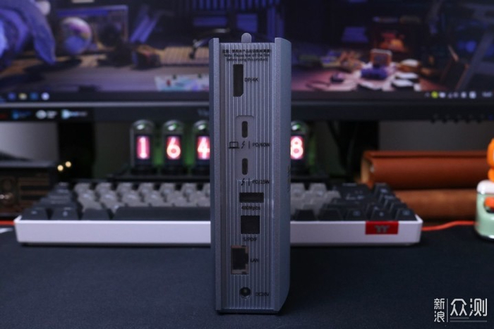 这一侧的接口,主要是实现功能的面板,从上往下,分别是DP1.4分屏操作时支持4K 60Hz的画面传输;可以给PD15W以及60W的快充,这也基本满足了电脑以及大功率设备的使用以及40Gbps的传输;480Mbps的USB2.0的接口;光线音频、千兆网口以及60WDC供电。