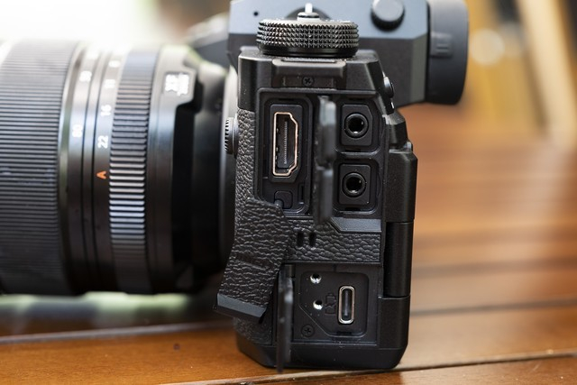 在接口方面,富士X-H2S提供了一个Type-C(USB 3.2 Gen 2)接口、一个HDMI接口、3.5毫米耳机孔、3.5毫米麦克风插孔、相机遥控器插孔。