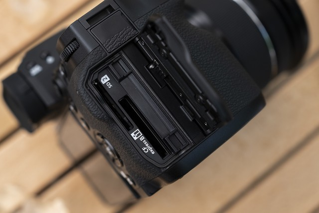 在机身两侧分别是接口和存储卡槽。富士X-H2S采用了SD卡和CFexpress卡双卡槽设计,对于拍摄高分辨率视频、经常使用高速连拍的专业用户,可以使用性能十分强悍的CFexpress存储卡;对于普通需求的用户来说,可以使用性价比较高的SD卡。