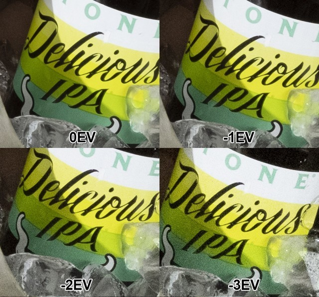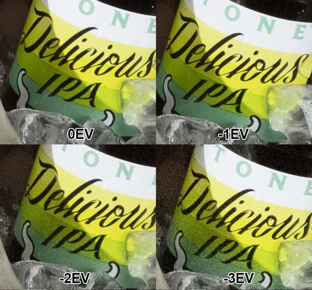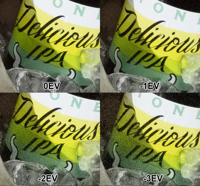 ISO 6400已经是非常极限的宽容度测试了,富士X-H2S的宽容度表现也不错。在这个级别的测试中,我们看到直到-3EV曝光的修复,画面始终没有出现偏色,仅仅是噪点的增加。