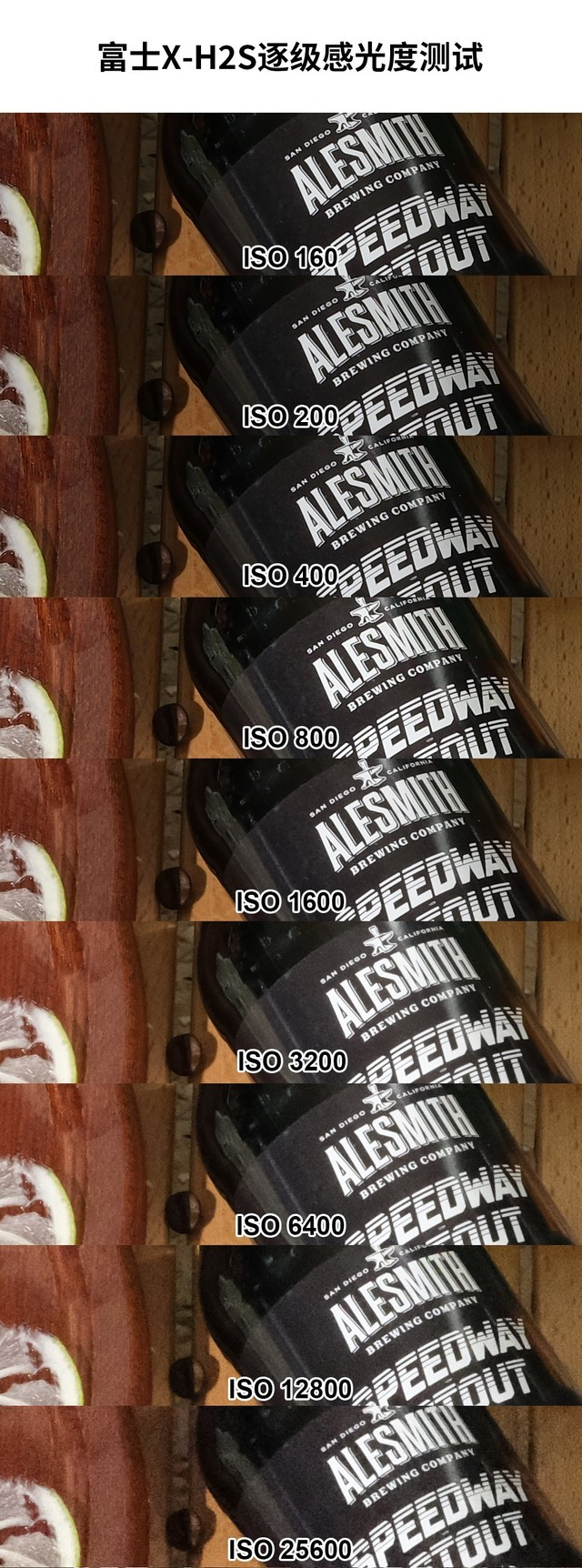 富士X-H2S采用了全新开发的2616万像素APS-C画幅的X-Trans CMOS 5 HS传感器和全新的X-Processor 5影像处理器,提供了感光度范围默认为ISO160-12800,向上可扩展至51200。首先对富士X-H2S这台相机各档感光度画质表现进行测试。拍摄时,我们将机位固定,下图为原图大小,对比使用100%实际截图展示。