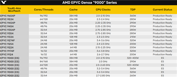 已经确认型号的有12款,最高端为霄龙9654P,P代表是单路型,96核心192线程,三级缓存多达384MB,但核心频率仅为2.0-2.15GHz,热设计功耗360W。