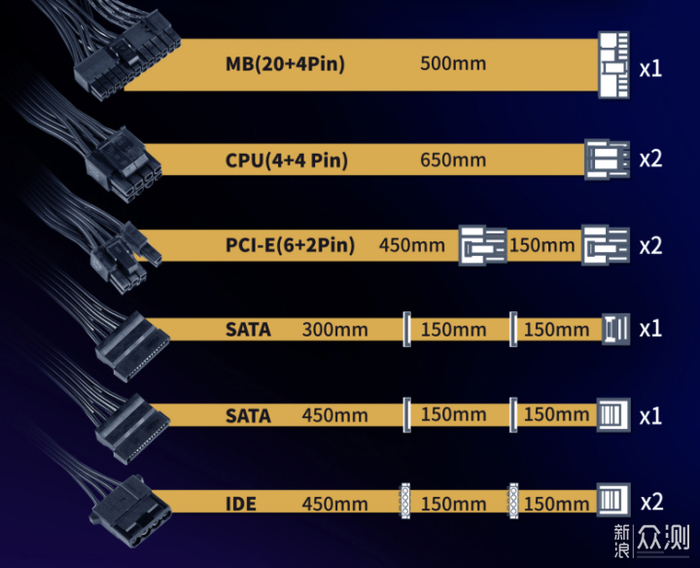 模组线还是延续的扁线,扁线好处当然就是好走线节省空间啦。线长就借用官方的尺寸图吧。这个规格的长度其实已兼顾大部分的机箱产品了,所以没啥可顾虑的。