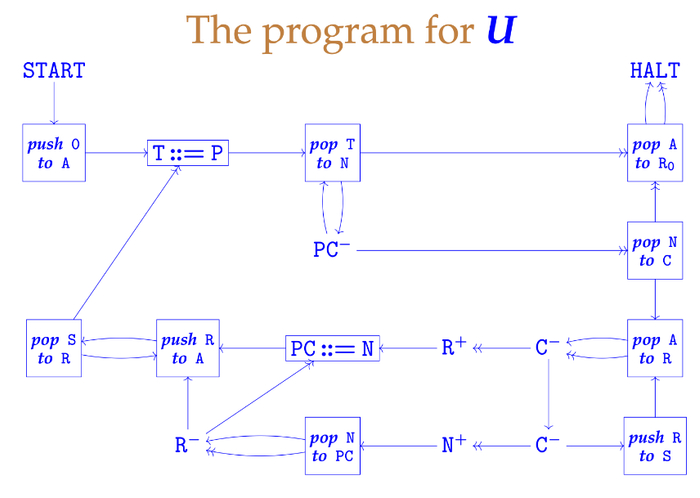 而如今,我们有了已经被设计得淋漓尽致的通用图灵机。几十年前,在剑桥大学,Ken Moody 博士编写了一个通用明斯基注册机: