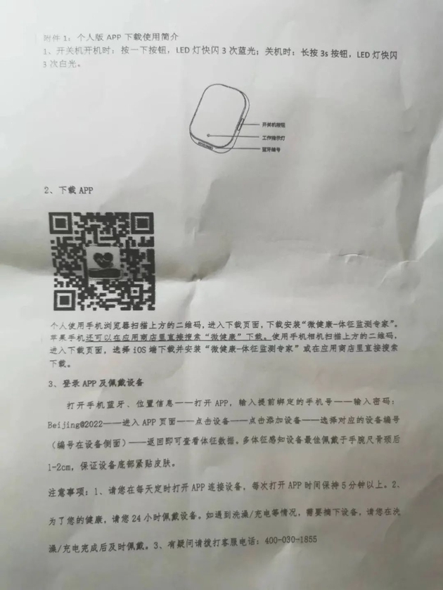 何先生:他说上面要求的,和手机连上能随时上报体温之类的信息,比较方便,必须要戴上。我肯定按照北京市防疫规定去执行,但没有哪条规定必须要戴手环。