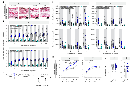 研究者进一步探讨中波紫外线暴露的性别效应,将小鼠暴露在紫外线环境中10周,实验结束后检验小鼠血液中相关蛋白水平的变化。结果发现,雄性小鼠血液中的食欲刺激素(ghrelin,又称胃生长激素释放素)水平和体重明显上升,而雌性小鼠却没有出现明显变化。另外,雄性小鼠比雌性小鼠表现出更多与新陈代谢有关的蛋白质变化。但是雄性和雌性小鼠的耗氧量没有显著差异,表明中波紫外线不会改变基础代谢。