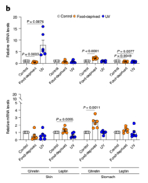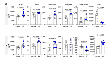 研究者发现UVB每天暴露,男性和女性血浆中ACTH、α-MSH和β-内啡肽显著增加。说明在中波紫外线暴露下雄性食物摄入量的增加不能用β-内啡肽的增加来解释,而是有其他未知的因素。对中波紫外线照射后小鼠血浆的进一步分析显示,雄性的胃饥饿素水平显著升高,无论是总形式或活性形式(酰基饥饿素),但在雌性中不存在。相反,暴露于UVB雄性的瘦素水平要低得多,而女性的瘦素水平显著增加。与对照小鼠相比,剥夺食物后胃饥饿素mRNA和蛋白质水平在雄性和雌性小鼠的胃里都明显升高。