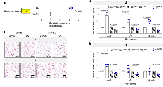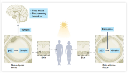 分子生物学实验表明,在男性UVB暴露的皮肤脂肪组织中p53直接上调胃饥饿素表达。皮下脂肪细胞中特异性敲除p53基因的雄性小鼠在阳光照射下不再增加进食行为。雌性之所以不受影响,是因为雌激素(estrogen)会干扰p53与饥饿素(ghrelin)启动子的相互作用,抑制饥饿素的表达和释放,从而在阳光照射下不会增加进食。
