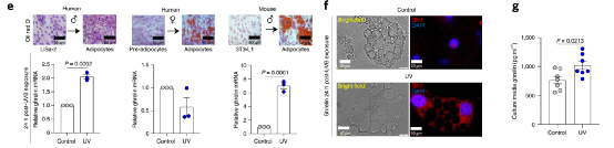 为确定中波紫外线照射下脂肪细胞的功能,研究者采用男性LiSa-2细胞进行分化、人类女性前脂肪细胞和小鼠雄性3T3-L1细胞转化为脂肪样细胞进行脂滴油红染色。细胞实验,紫外线处理的细胞中ghrelin、GOAT和Pcsk1 mRNA水平显著升高。UVB处理对人类女性的脂肪细胞胃饥饿素表达无影响。在UVB的细胞培养液中,Ghrelin蛋白的分泌也有所增加。添加胃饥饿素o -酰基转移酶(GOAT)抑制剂GO-CoA-Tat可以降低胃饥饿素的产生。