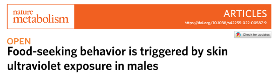 2022年7月11日,以色列特拉维夫大学的研究人员在 Nature 子刊 Nature Metabolism 上发表了题为:Food-seeking behavior is triggered by skin ultraviolet exposure in males 的研究论文。该研究发现,阳光照射会通过皮肤内脂肪组织分泌饥饿素(ghrelin)来刺激男性(雄性)的进食和增重,女性却不受影响。这一发现揭示了阳光能够影响进食行为和全身能量平衡,而且对不同性别产生不同影响。