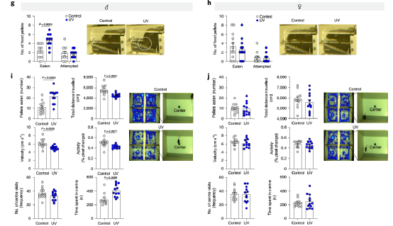 接下来,研究者探究了暴露于uvb的雄性小鼠的食物摄入量变化是否与食物相关行为的变化有关。测试实验结果显示,紫外线(UVB)暴露的雄鼠的食用食物颗粒数和在测试中心停留的时间增加,同时测试期间的活动水平、活动总距离显著减少。紫外线(UVB)暴露的雌性小鼠没有明显的同类变化。虽然焦虑会影响食物摄入,有食物的情况下,雄性在测试中心度过的总时间延长了三倍,表明接受UVB的雄性可能会经历更少的焦虑,而其动机是食物。