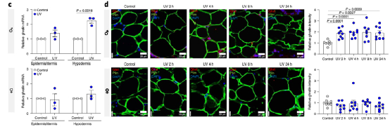 接下来,研究者将离体人体皮肤暴露在每天(5天)的中波紫外线下辐射(500 mJ/cm2),发现雄性真皮下脂肪组织中ghrelin mRNA表达水平显著升高。相反,中波紫外线对女性皮肤下皮层的ghrelin表达没有影响。男性和女性的皮肤表皮和真皮层胃饥饿素水平没有变化。在男性皮下脂肪细胞中波紫外线暴露后8小时,胃饥饿素蛋白表达高峰,但女性没有。