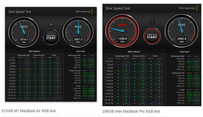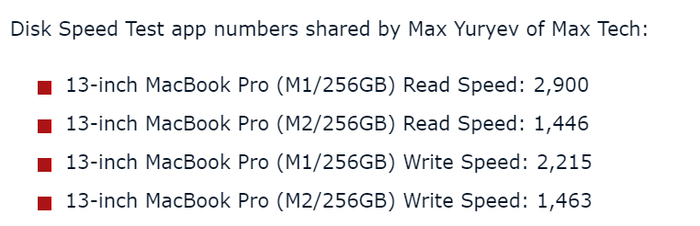 Max Tech 和 Created Tech 等 YouTube 博主用 Blackmagic 的 Disk Speed Test APP 测试了 M2 MacBook Pro 256GB 版本的硬盘,发现其 SSD 的读写速度都在 1450 MB/s 左右,与搭载 M1 芯片和 256GB 存储空间的 13 英寸 MacBook Pro 相比,读取速度约慢 50%,写入速度约慢 30%。