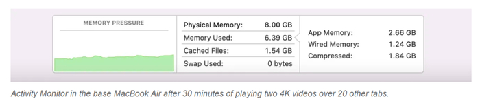 那么,这些差异会对消费者产生影响吗?如果只谈日常使用,Air 的潜在消费者可能感受不到 256 GB 和 512 GB 之间存在巨大差异。测试者在两台机器上用 25 个打开的 Chrome 标签页播放了两个 4K YouTube 视频 30 分钟,二者都没有用到虚拟内存,启动时间也几乎一样。她把两个设备并排放置了很多次。在打开日常使用的应用程序(包括 Chrome、Safari、Messages、Photos、Activity Monitor、Slack、Music 等)时,她没有看到太大的区别。