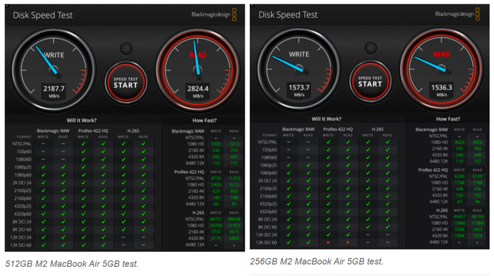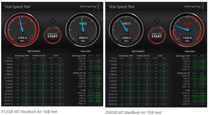 根据在 Blackmagic 的 Disk Speed Test 程序中观察到的结果,M2 MacBook Air 的基本型号硬盘写入速度通常比 512GB 型号慢 15% 到 30%,读取速度则会慢 40% 到 50%。