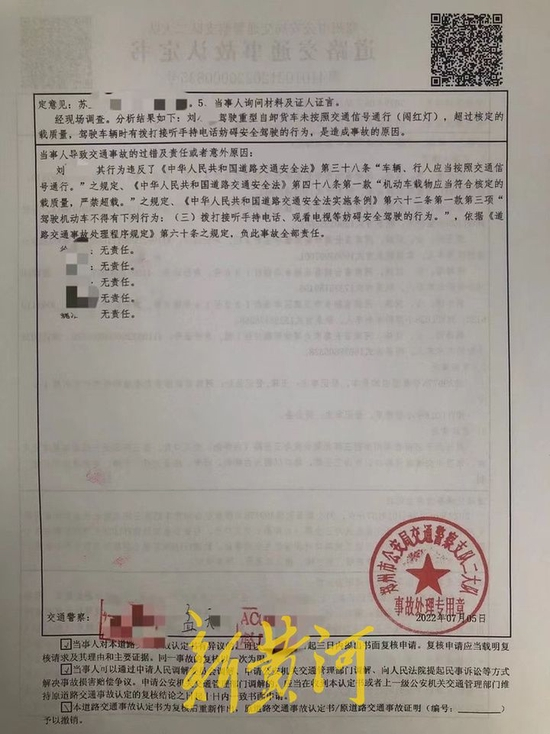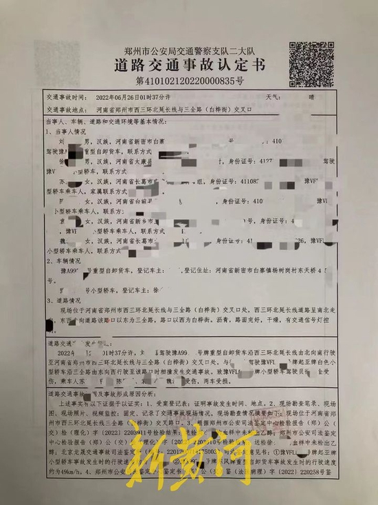 对于此事,高德打车平台向记者提供了郑州市公安局交通警察支队的事故认定书。其中显示,刘某驾驶重型自卸货车未按照交通信号灯通行,超过核定的载重量,驾驶车辆时有拨打接听手持电话妨碍安全驾驶的行为,是造成事故的原因。事故中小型轿车正常行驶,驾驶员徐某对此事故无责任。