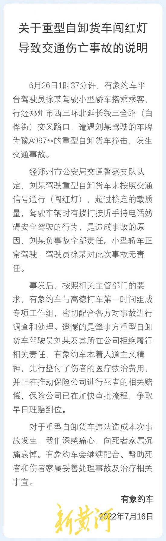 高德打车平台表示,事发后,按照相关主管部门的要求,“有象约车”与高德打车第一时间组成专项工作组,密切配合各方对事故进行调查和处理。但因肇事方重型自卸货车驾驶员刘某及其所在公司拒绝履行相关责任,“有象约车”先行垫付了伤者的医疗救治费用,并正在推动保险公司进行死者的相关赔偿,保险公司已在加快审批流程,争取早日理赔到位。